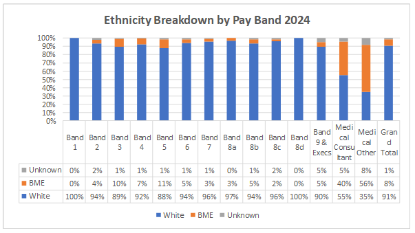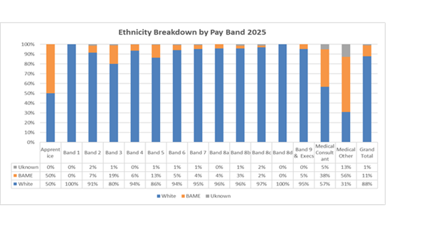- Very low levels of BAME staff are within higher bands, (excluding medical grades).