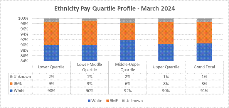 Comparing this 2025 data with the previous year shows the mean gender pay for staff on AFC & VSM pay has increased from the previous year from 1.75% in 2024 to 3.31%. The median gender pay gap has decreased from 13.43% in 2024 to 0.24%