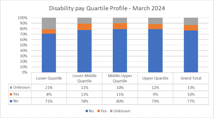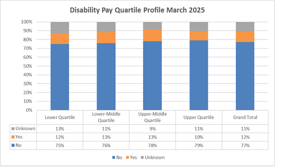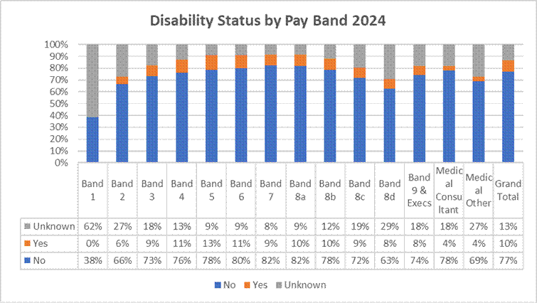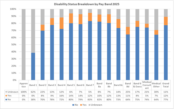 The graph below provides the Trusts disability profile breakdown by pay band as of March 2025 when reporting commenced.